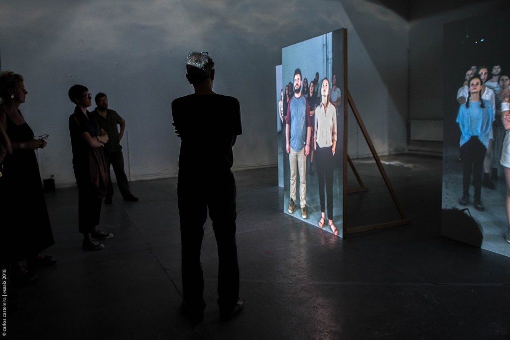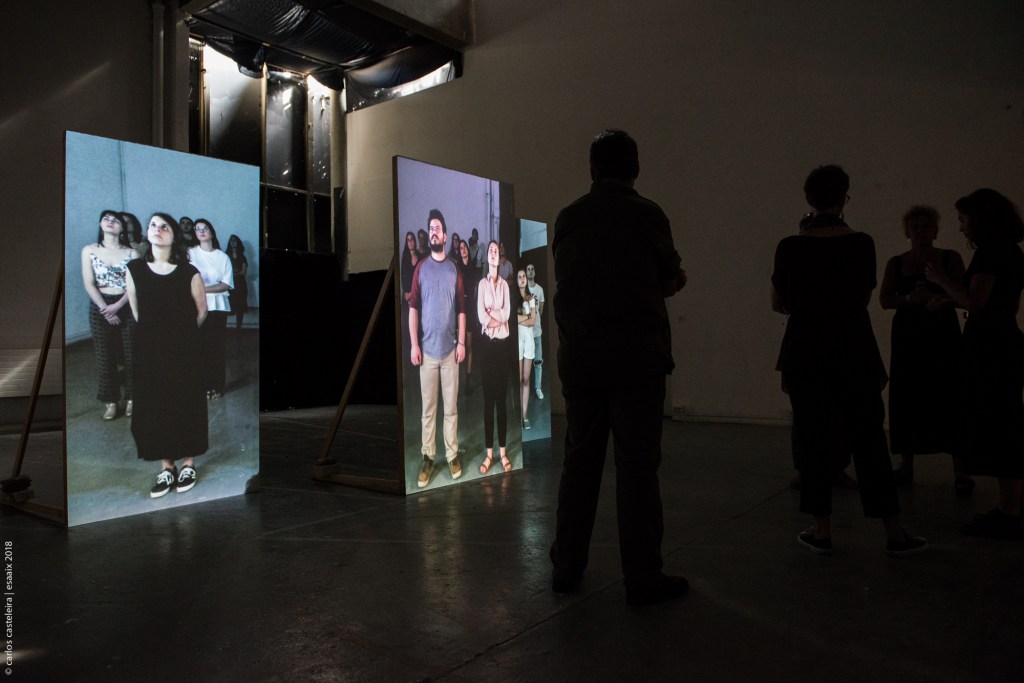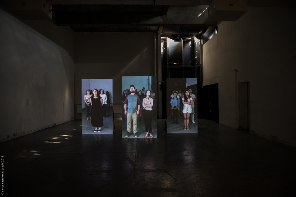 Installation in situ à échelle 1. Le spectateur devient acteur et les acteurs spectateurs. Le visiteur, par son « entrée en scène », se retrouve inséré dans la vidéo-projection. Par une réappropriation de l’espace, le visiteur devient un élément de celui-ci.