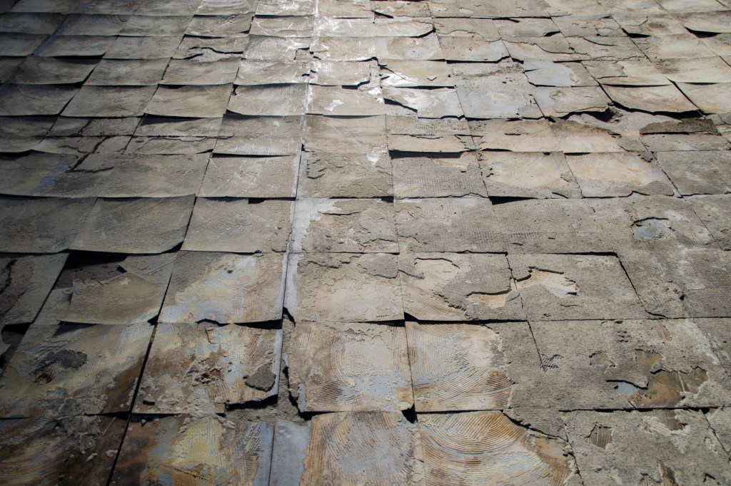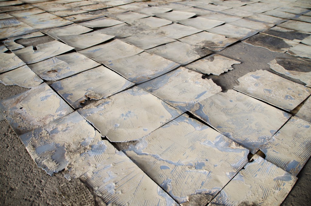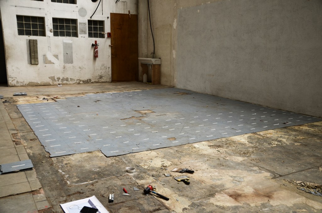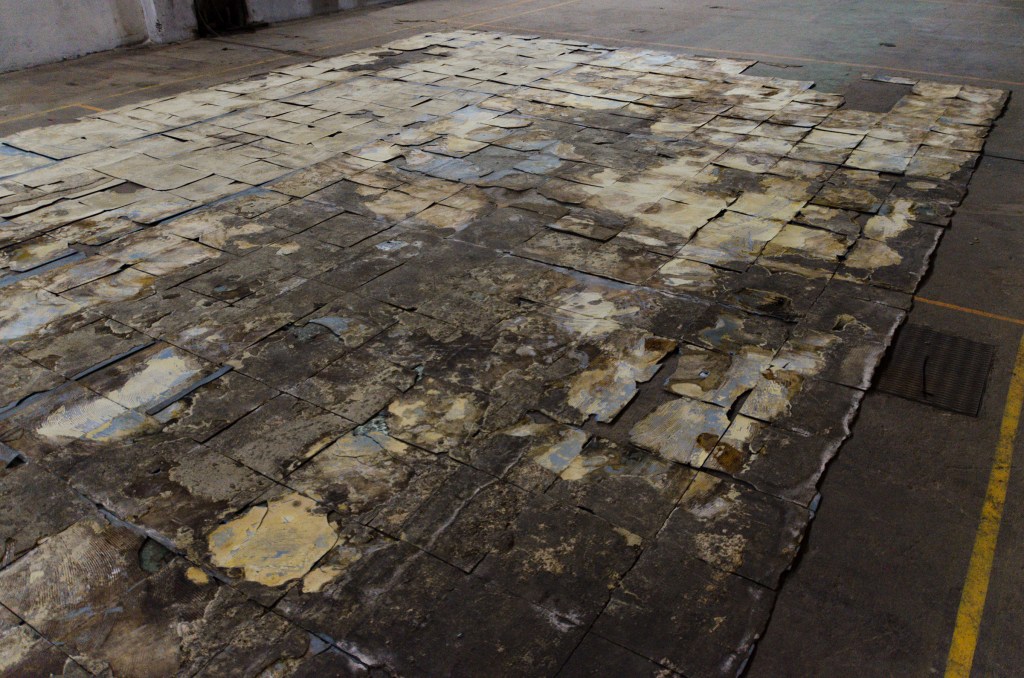 424 dalles bleues en polychlorure de vinyle que j’ai scotchée puis numérotée avant de les taper, décoller, casser, racler et ramasser pour ensuite les trier, les classer et les retourner.