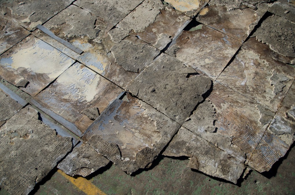 Tous ces gestes accomplis à répétition m’ont ainsi amenée à interroger l’espace en mutation dans lequel je me trouve ; à regarder le restant, à préserver l’existant, à découvrir les discrétions, les recoins invisibles, à imaginer la vie d’avant, à inventer le lieu et chercher les accidents. L’architecture du lieu est devenu un témoin précieux de l’activité passée. Le sol, cartographie infinie, m’apparaît comme la cicatrice d’une histoire inconnue sur laquelle j’enquête, une marque discrète mais visible si tant est qu’on ne l’observe.