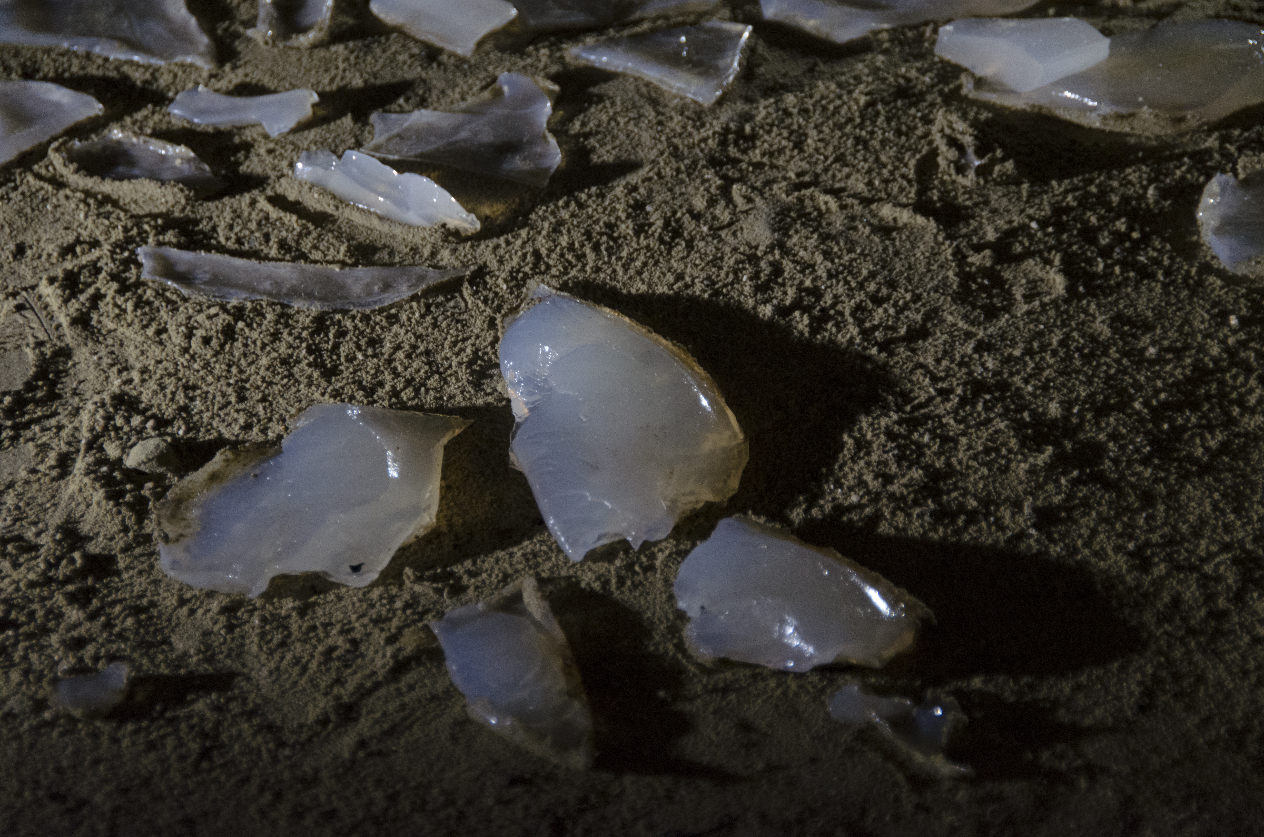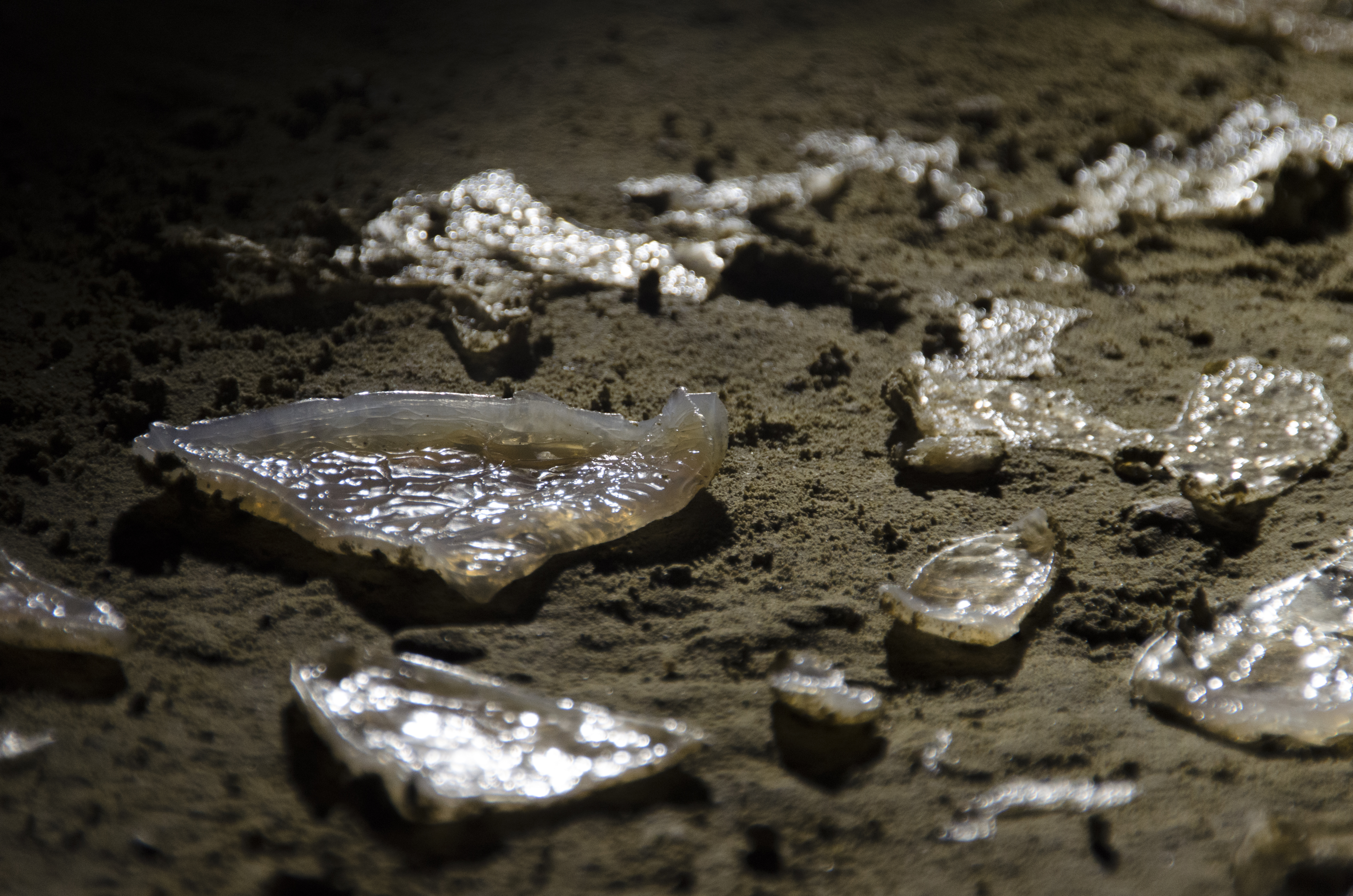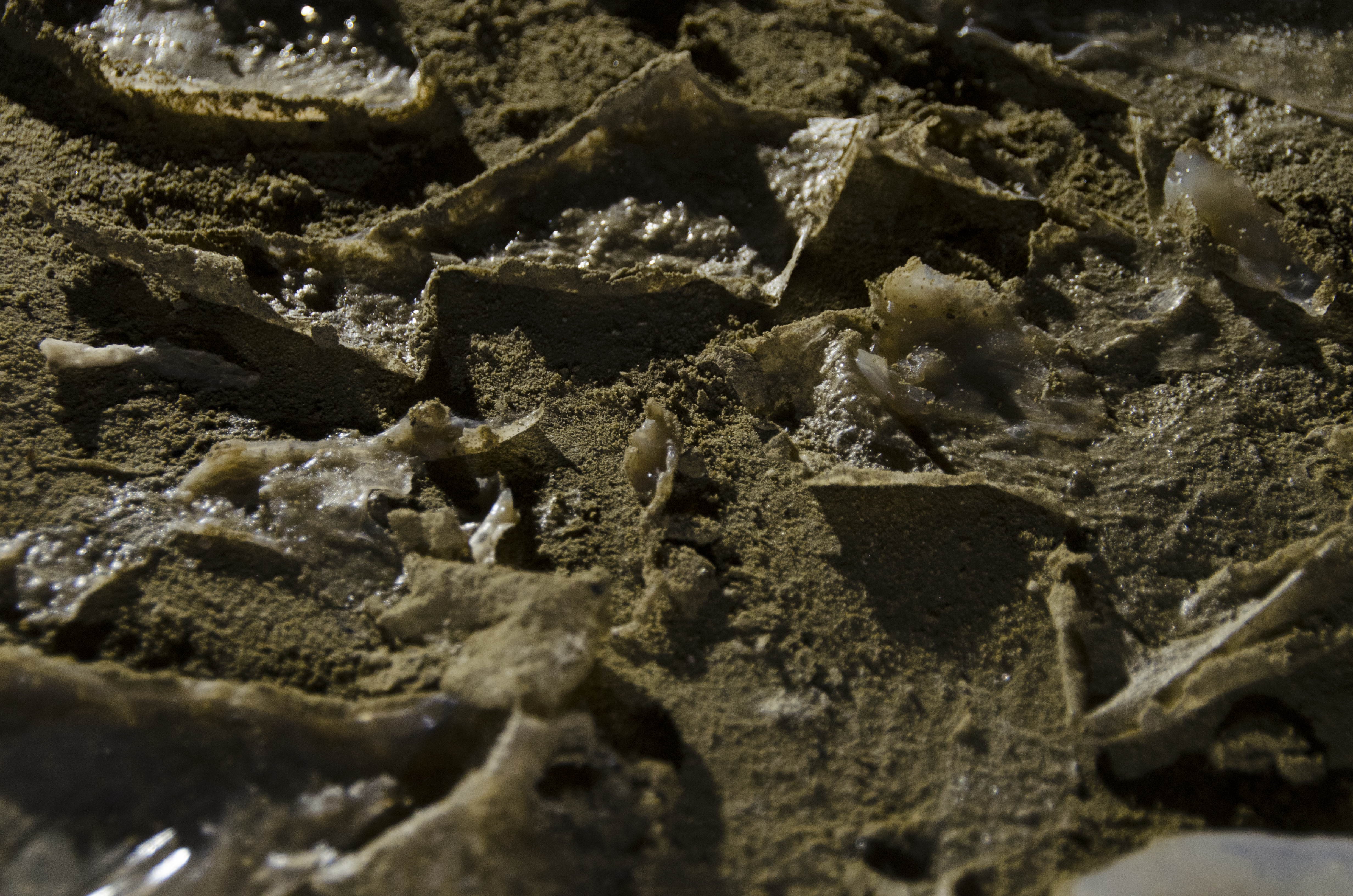 «Ici il est question de transfert et d’échange entre l’œuvre et son support. Les formes qui reposent sur le sol sont faites d’agar-agar, produit gélifiant végétal obtenu à partir d’un mélange d’eau et de poudre extraite d’algues.