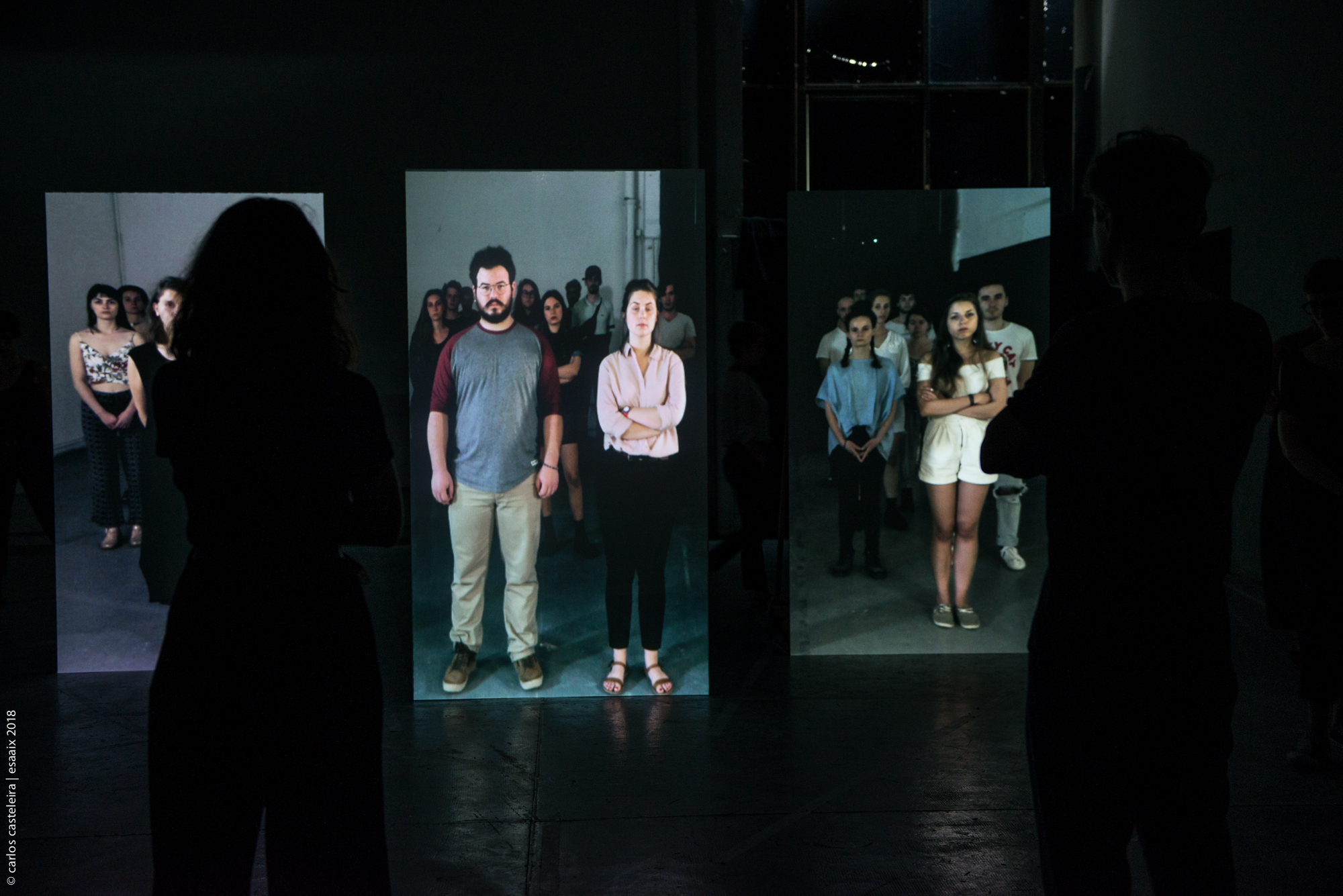 Installation in situ à échelle 1. Le spectateur devient acteur et les acteurs spectateurs. Le visiteur, par son « entrée en scène », se retrouve inséré dans la vidéo-projection. Par une réappropriation de l’espace, le visiteur devient un élément de celui-ci.
